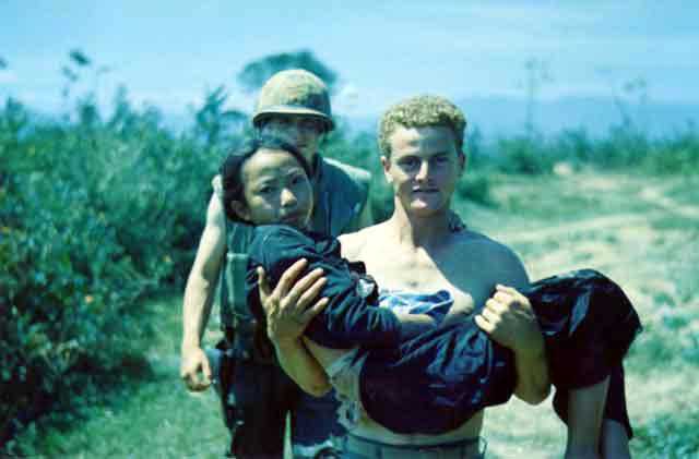 Corpsman carrying a wounded woman. |